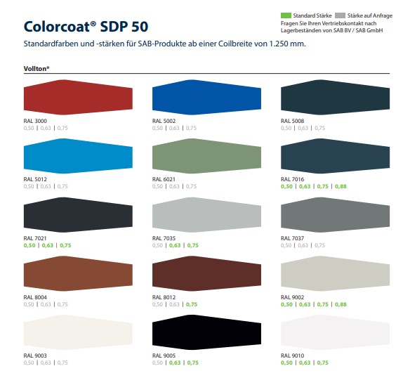 Colorcoat SDP 50 ist standardmäßig in vielen Unifarben und verschiedenen Metallics verfügbar. SAB bietet eine breite Auswahl an Standardprodukten in verschiedenen Dicken lagermäßig an. Siehe dazu unsere Colorcoat SDP 50 Produktseite oder überprüfen Sie die neue SAB Farbkarte Colorcoat.