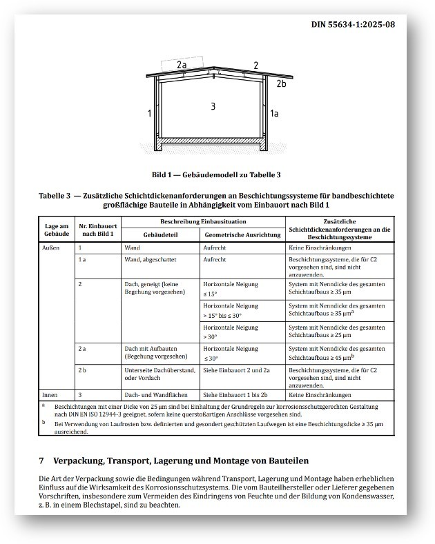 Im August 2025 wurde die neue DIN 55634-1 zum Korrosionsschutz von tragenden dünnwandigen Bauteilen aus Stahl veröffentlicht. Neu in dieser deutschen Norm ist, dass für geneigte Dächer eine minimale Beschichtungsdicke von 35 µm vorgeschrieben wird.