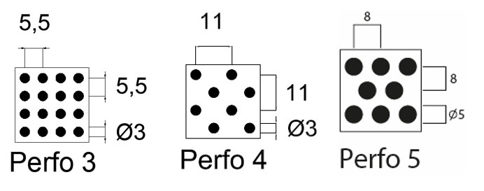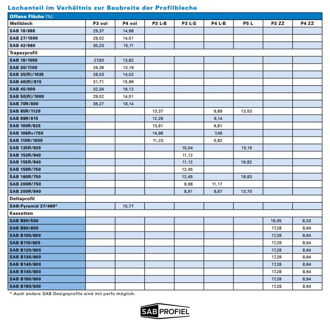 SAB liefert standardmäßig Perforationsmuster: Perfo 3 (Perforationsgrad von 23,4%) und Perfo 4 (Perforationsgrad 11,7%). SAB-profil GmbH liefert auch Perfo 5 (Perforationsgrad von 35,4%). Bei größeren Mengen kann SAB viele beliebige Perforationsmuster liefern.